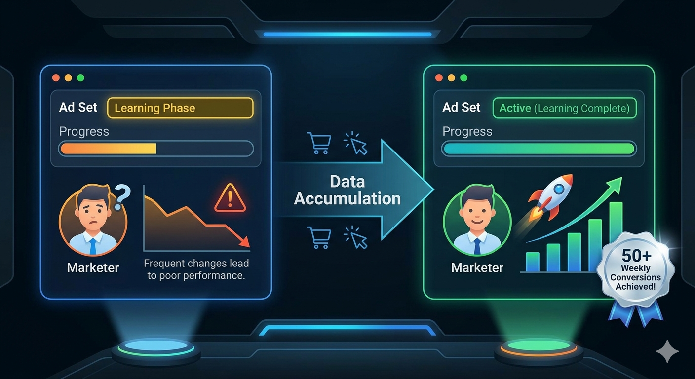 메타의 머신러닝은 소재 하나가 주당 최소 50건의 전환을 확보해야 비로소 '학습 완료' 상태가 됩니다.